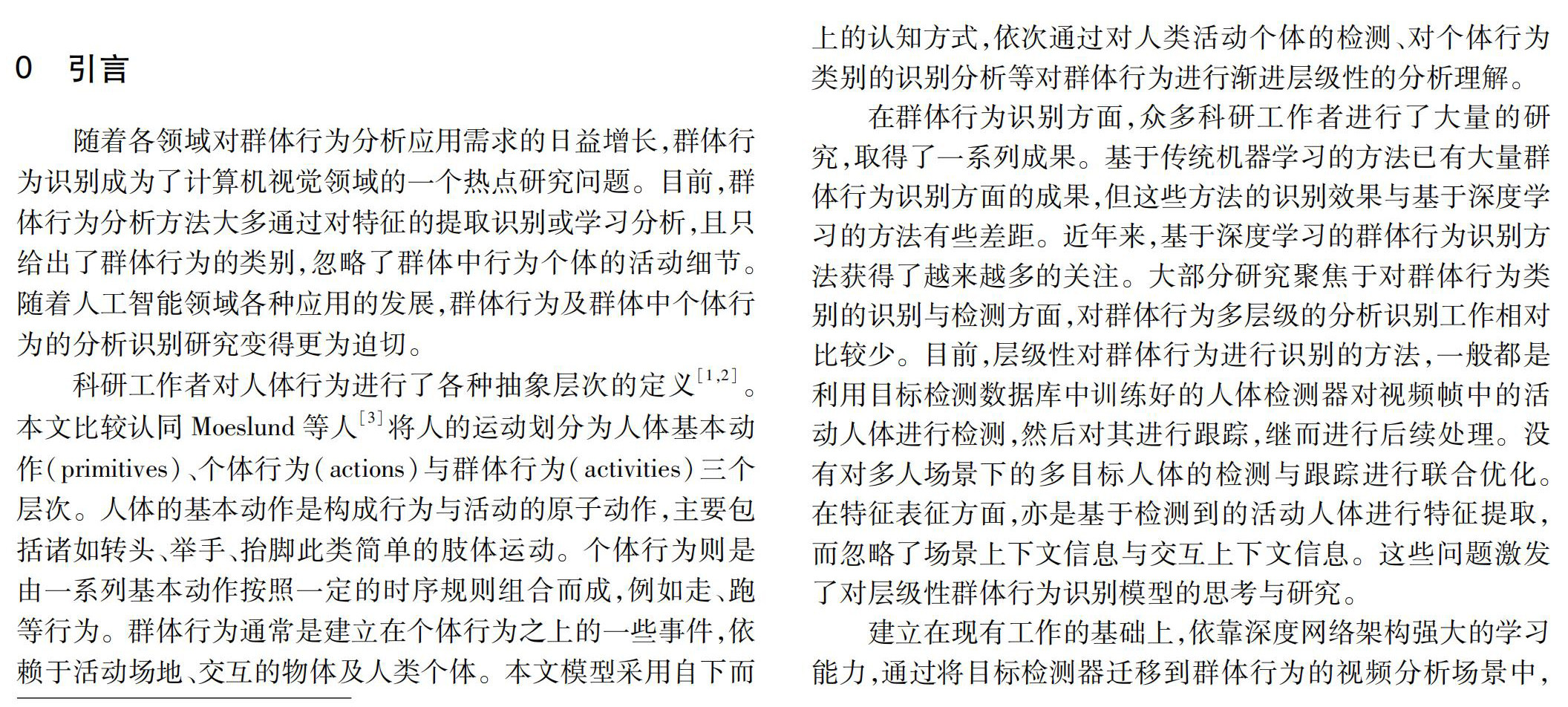 摘 要:群体行为的多层次深度分析是行为识别领域亟待解决的重要问题。在深度神经网络研究的基础上,提出了群体行为识别的层级性分析模型。基于调控网络的迁移学习,实现了行为群体中多人体的时序一致性检测;通过融合时空特征学习,完成了群体行为中时长无约束的个体行为识别;通过场景中个体行为类别、交互场景上下文信息的融合,实现了对群体行为稳定有效的识别。(剩余24907字)