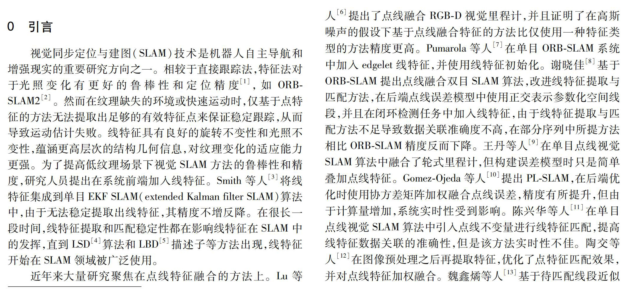 摘 要:针对现有点线融合视觉SLAM(simultaneous localization and mapping)方法中线提取和线匹配准确度低导致定位精度下降的问题,从多维度对现有点线融合双目视觉SLAM方法进行了改进研究。通过内部参数调整和长度阈值筛选改进LSD(line segment detection)提取质量;基于几何约束将线特征匹配抽象为稀疏最小化问题,求得最优解即找到线段最佳匹配;基于图像纹理评分和匹配成功特征数量分配点线特征权重,优化了后端点线特征融合策略。(剩余12818字)