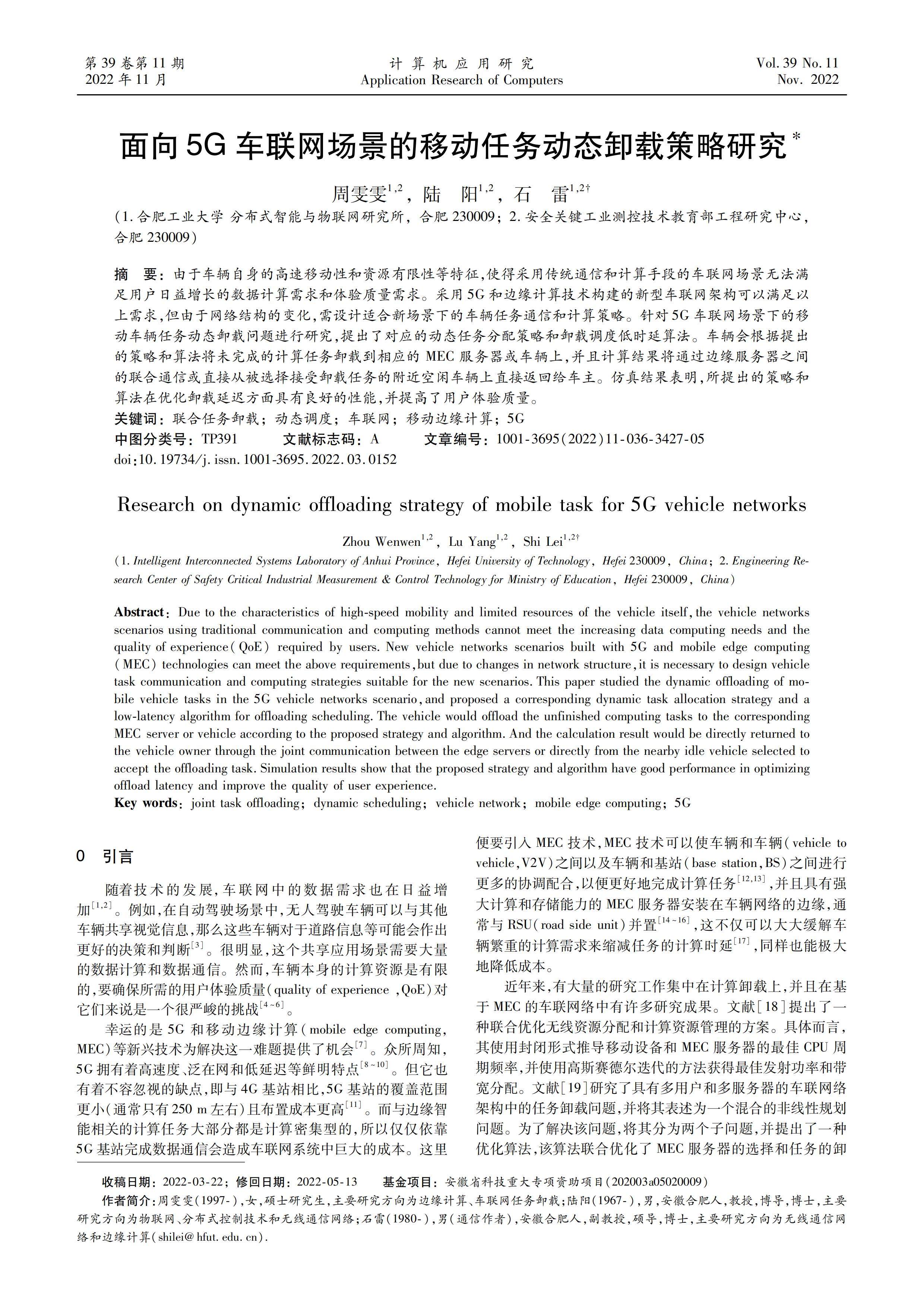 摘 要:由于车辆自身的高速移动性和资源有限性等特征,使得采用传统通信和计算手段的车联网场景无法满足用户日益增长的数据计算需求和体验质量需求。采用5G和边缘计算技术构建的新型车联网架构可以满足以上需求,但由于网络结构的变化,需设计适合新场景下的车辆任务通信和计算策略。针对5G车联网场景下的移动车辆任务动态卸载问题进行研究,提出了对应的动态任务分配策略和卸载调度低时延算法。(剩余15041字)