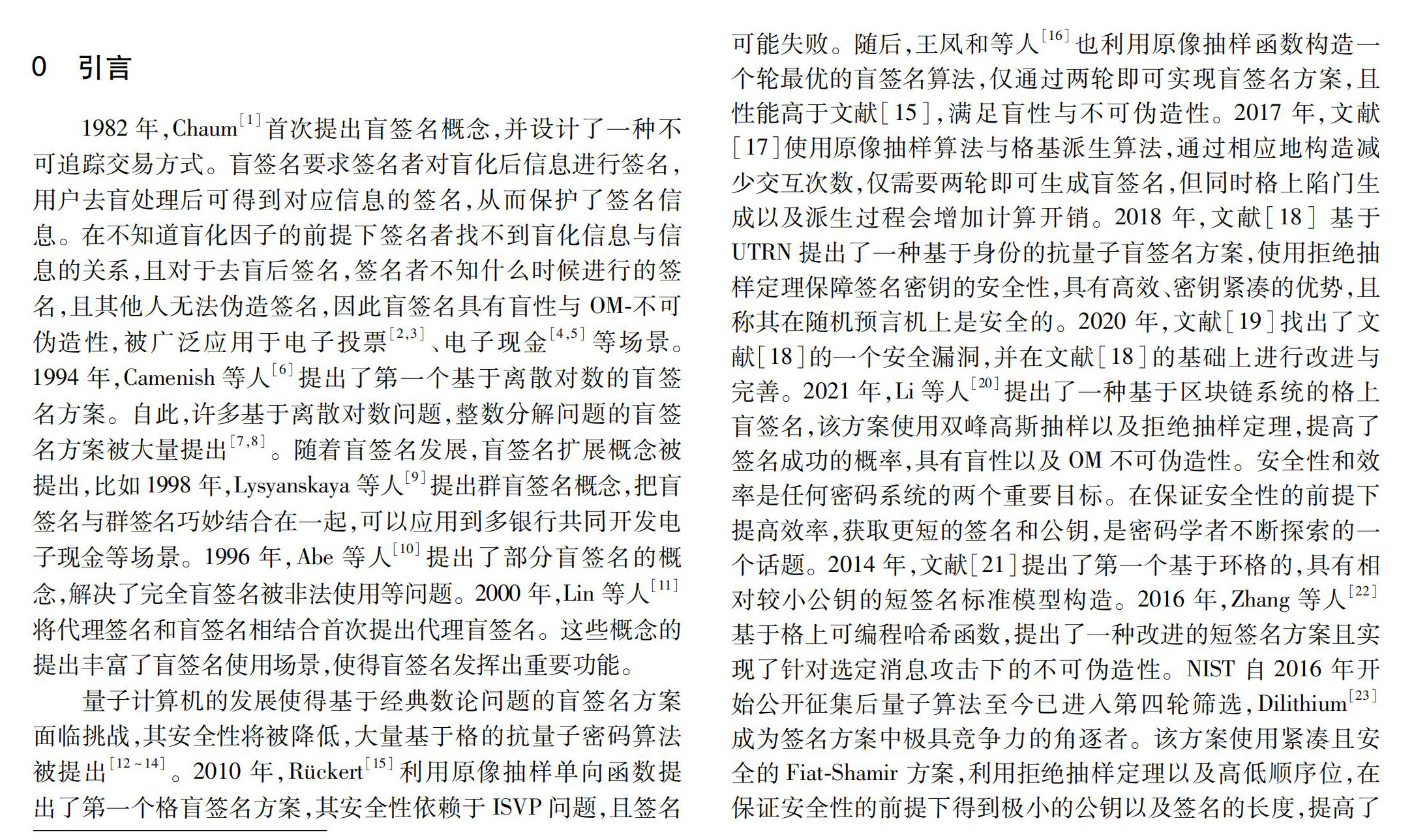 摘 要:为了更好地保护用户隐私安全,使签名具有抗量子性,使用拒绝抽样定理以及高低顺序位关系提出了一种理想格上安全高效的盲签名方案。该方案无须复杂的陷门函数,通过简单的计算即可实现盲签名功能。通过分析可知,该方案安全性规约于格上ISISn,m,q,η(s)困难问题,具有盲性以及one-more(OM)不可伪造性,且公私钥短,签名长度仅为llodq,具有安全高效的优势。(剩余8645字)