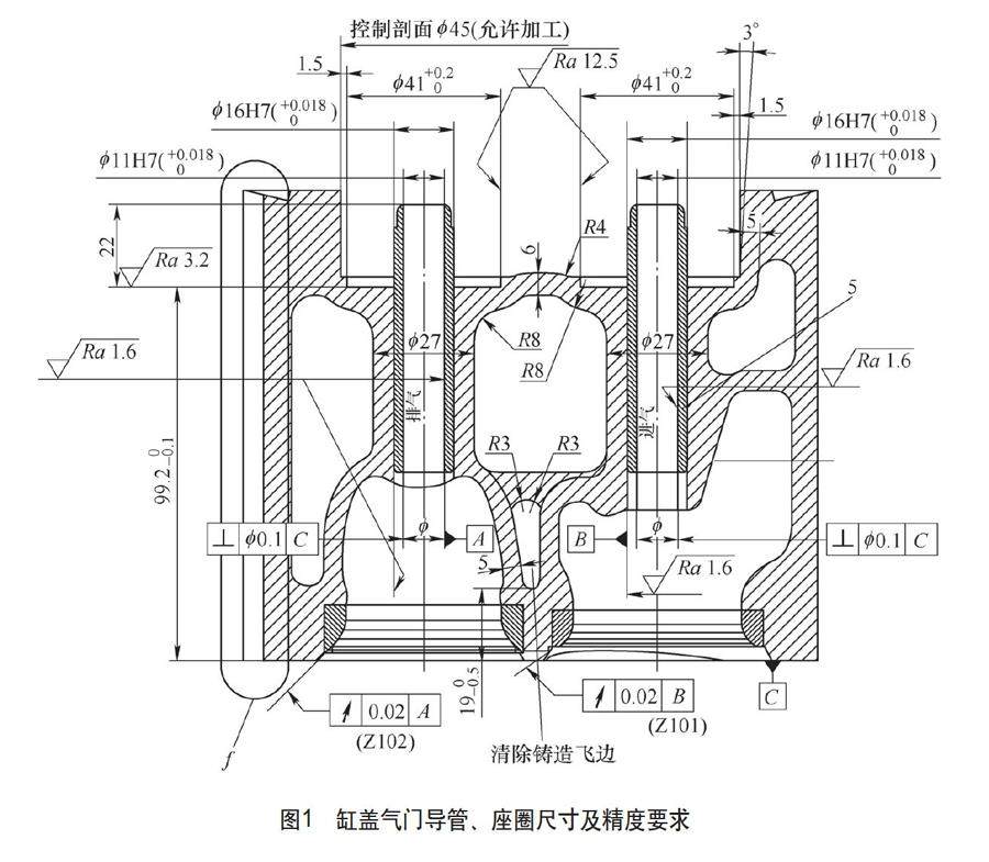 WD615系列发动机缸盖气门导管、座圈加工尺寸及精度要求如图1所示,进气、排气导管孔内径尺寸要求f11H7(+0.018 +0),导管中心相较于缸盖下表面(基准C)垂直度要求f0.1mm,座圈面相较于导管中心(基准A、基准B)径向圆跳动要求为0.02mm。(剩余3083字)