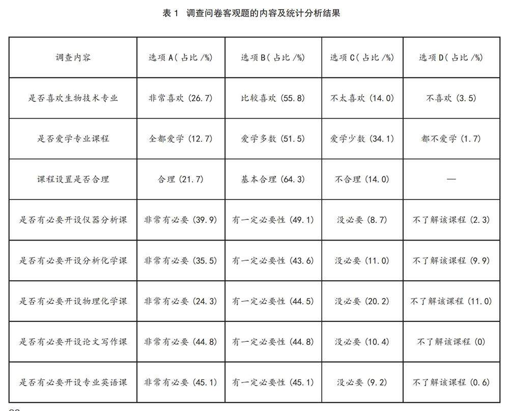 [摘 要]为了解生物技术专业学生对课程设置的看法,征求其对课程设置改革的意见和建议,对黑龙江省某师范大学生物技术专业学生进行了问卷调查。结果表明,绝大多数学生认为现行课程设置比较合理,建议开设分子生物学、专业英语、论文写作等课程,增加实验课程数量或学时,精简选修课程。针对上述调查结果,笔者建议生物技术专业在改革课程设置、修订人才培养方案时,应明确培养目标、优化课程体系、整合课程内容、加强实验教学。(剩余9893字)