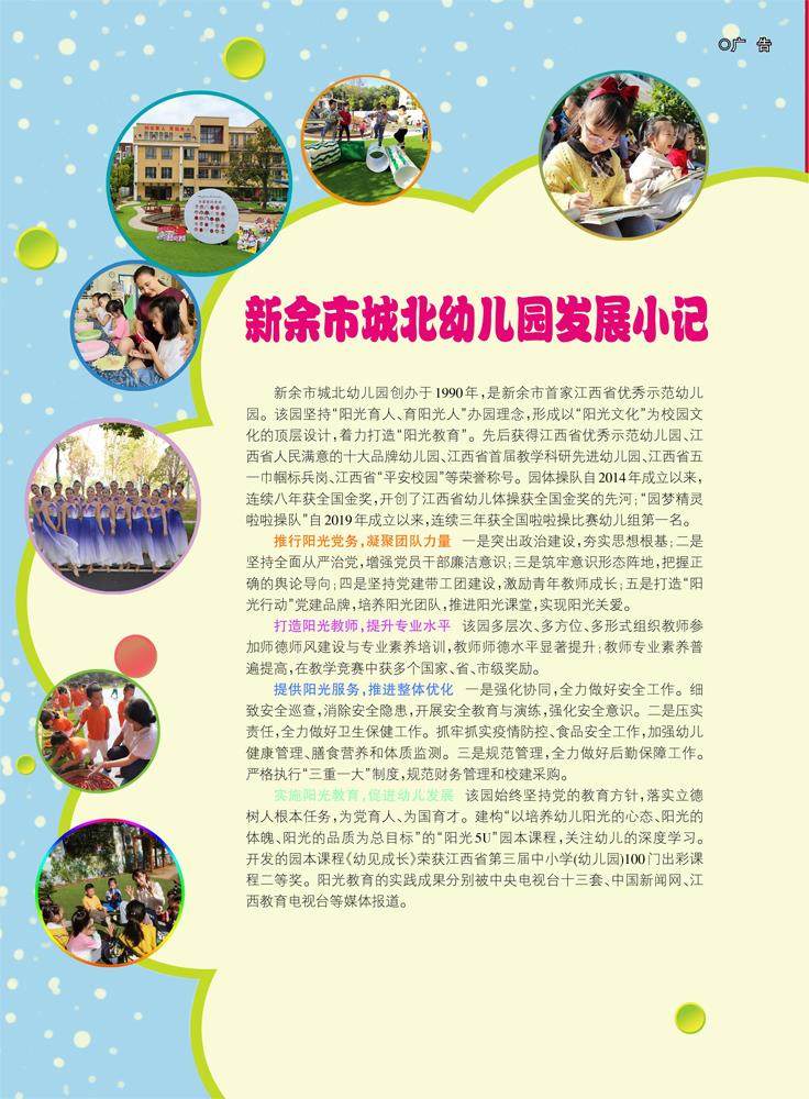 新余市城北幼儿园创办于1990年,是新余市首家江西省优秀示范幼儿园。该园坚持“阳光育人、育阳光人”办园理念,形成以“阳光文化”为校园文化的顶层设计,着力打造“阳光教育”。先后获得江西省优秀示范幼儿园、江西省人民满意的十大品牌幼儿园、江西省首届教学科研先进幼儿园、江西省五一巾帼标兵岗、江西省“平安校园”等荣誉称号。(剩余652字)