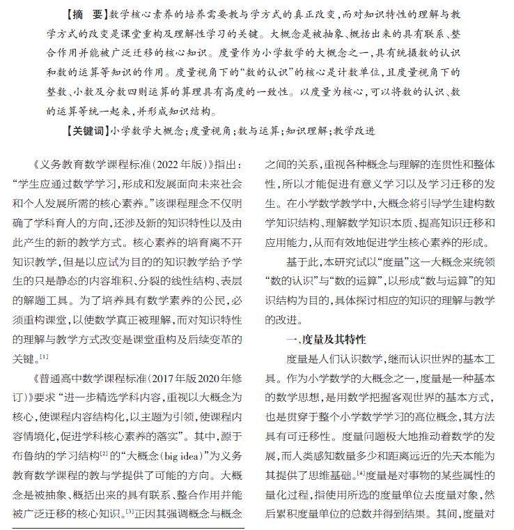 【摘 要】数学核心素养的培养需要教与学方式的真正改变,而对知识特性的理解与教学方式的改变是课堂重构及理解性学习的关键。大概念是被抽象、概括出来的具有联系、整合作用并能被广泛迁移的核心知识。度量作为小学数学的大概念之一,具有统摄数的认识和数的运算等知识的作用。度量视角下的“数的认识”的核心是计数单位,且度量视角下的整数、小数及分数四则运算的算理具有高度的一致性。(剩余5564字)