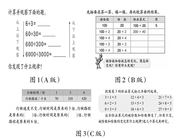 【摘 要】教材是重要的教学资源。以三个版本教材中“商不变性质”的相关内容为基础,结合对比分析与实证研究,发现:丰富多彩、适度开放的情境有利于学生抽象出数学问题;举例验证过程的完整性有利于学生提高推理能力;对观察顺序等具体问题进行引导有利于学生进行数学表达。