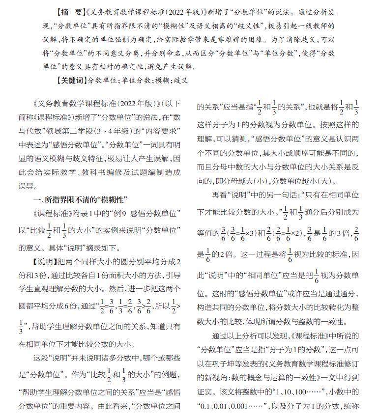 【摘 要】《义务教育数学课程标准(2022年版)》新增了“分数单位”的说法。通过分析发现,“分数单位”具有所指界限不清的“模糊性”及语义相离的“歧义性”,极易引起一线教师的误解,将不确定的单位强制为确定,给实际教学带来是非难辨的困难。为了消除歧义,可以将“分数单位”的不同意义分离,并分别命名,从而区分“分数单位”与“单位分数”,使得“分数单位”的意义具有相对的确定性,避免产生误解。(剩余5535字)