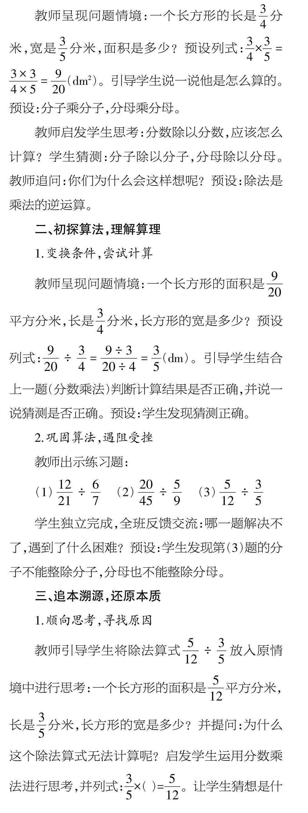 除法是乘法的逆运算。通过分数乘法的意义帮助学生理解分数除法的算理与算法,可以采用以下教学过程。