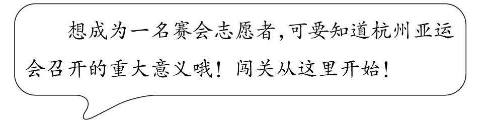 2023年9月23日,第19届亚运会将在我们的省会杭州举行。杭州是我国继北京、广州之后第三座成功申办亚运会的城市。作为浙江人的我多荣耀啊!在这样的盛会里,我怎么甘心当一名旁观者呢!亲爱的小朋友,在这趟赛会志愿者通关之旅中,邀你为我助力!