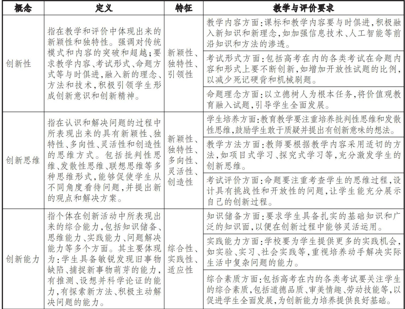 教育部在2023—2025年出台的普通高校招生工作通知中,分别以“创新性”“创新思维”和“创新能力”为核心概念表达当年对创新素养的评价主张。面对不同的评价政策用词,一线教师既要辨明它们的不同要求、把握它们的内在关联,又要结合相关实践分析评价走向,还要探索如何以创新素养评价引领课堂教学变革。
