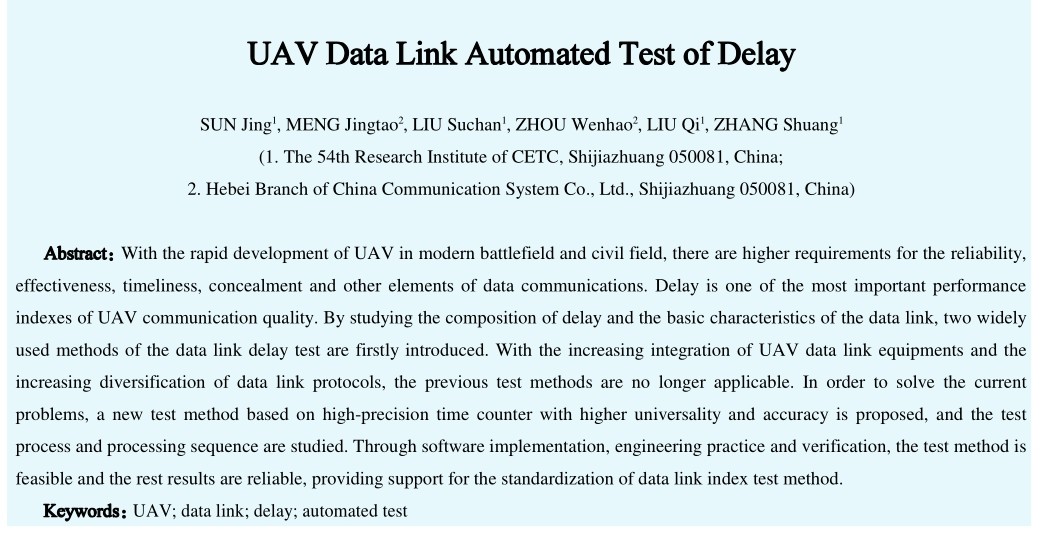 摘要:随着无人机在现代战场与民用领域中的飞速发展,数据通信的可靠性、有效性、及时性和隐蔽性等要素也被提出了更高的要求。时延是无人机通信质量中最重要的性能指标之一。通过对时延的组成与数据链基本特性的研究,首先介绍了2种曾广泛使用的数据链时延测试方法。随着无人机数据链设备集成度越来越高,数据链协议越来越多样化,以往的测试方法已经不再适用。(剩余6057字)