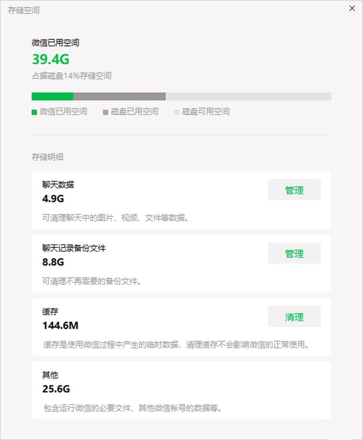 新PC版《微信》最大的变化就是带来了“存储空间管理”功能。这个功能让用户可以查看自己《微信》的已用存储空间,以及可以对“聊天数据、聊天记录备份文件、缓存”这三大类文件进行清理操作,而占用最多的“其他”这一分类则无法清理。(剩余1438字)