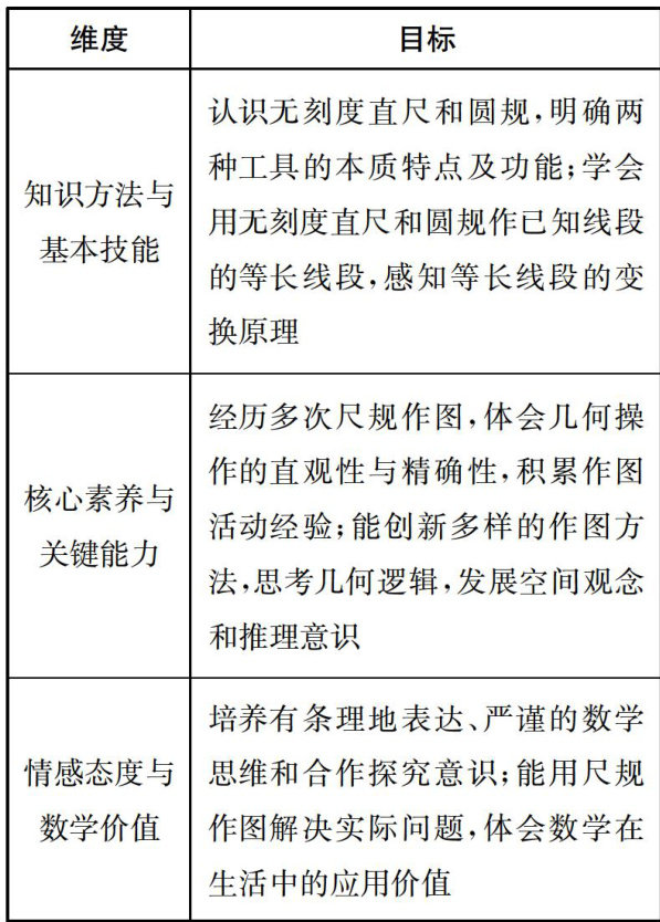 《义务教育数学课程标准(2022年版)》(以下简称“新课标"在“图形与几何"领域明确提出将“尺规作图"内容引入小学数学课程的学习范畴。尺规作图作为小学数学中的新内容,其核心概念是什么、教学目标怎么确立、教学如何展开等,都是需要攻克的重要课题。如果将某一知识系统作为一棵树,这棵树的生长过程表现为若干节“课”,处于起点或节点的课,谓之“种子课”[1本文结合第二学段“尺规作图”的种子课—《用无刻度直尺和圆规作等长线段》的教学,谈谈相关探索。(剩余5055字)