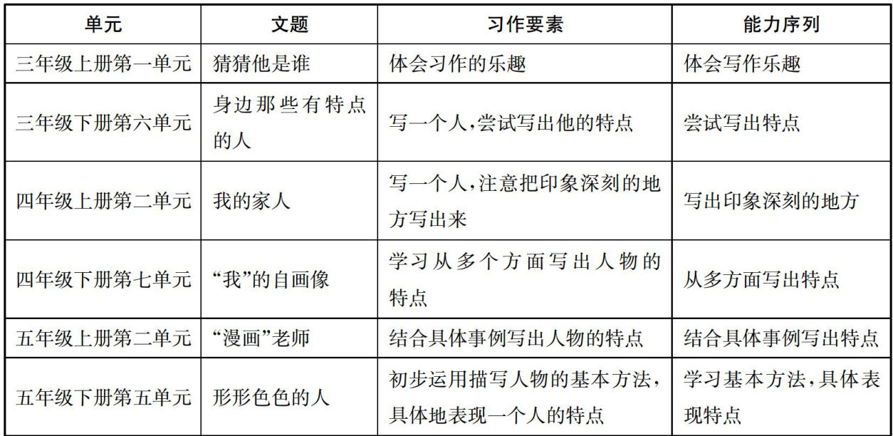 统编小学语文五年级下册第五单元是‘学习写人”的习作单元。在本单元之前,教材已经安排了五次关于写人的习作,这六次习作训练的习作要素和能力序列如下页表1所示。