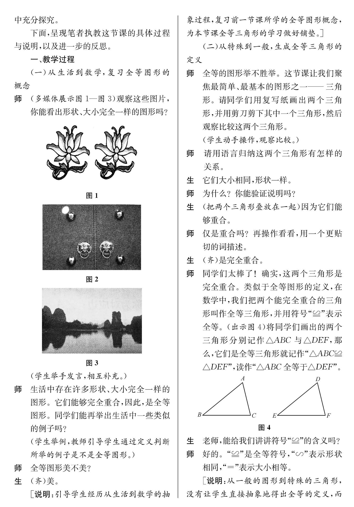 摘要:《全等三角形》一课,内容包括全等三角形的概念和性质,比较简单。教学中,要把简单的内容“教活”“教深”,就要基于知识的产生与发展、知识之间的联系,突出过程性,强调探究性。具体地,从生活到数学、从一般(图形)到特殊(三角形)、从整体(概念)到局部(性质)、从静态到动态、从发现到应用,设计丰富的学习活动,让学生在“做数学”的过程中充分探究。(剩余4294字)