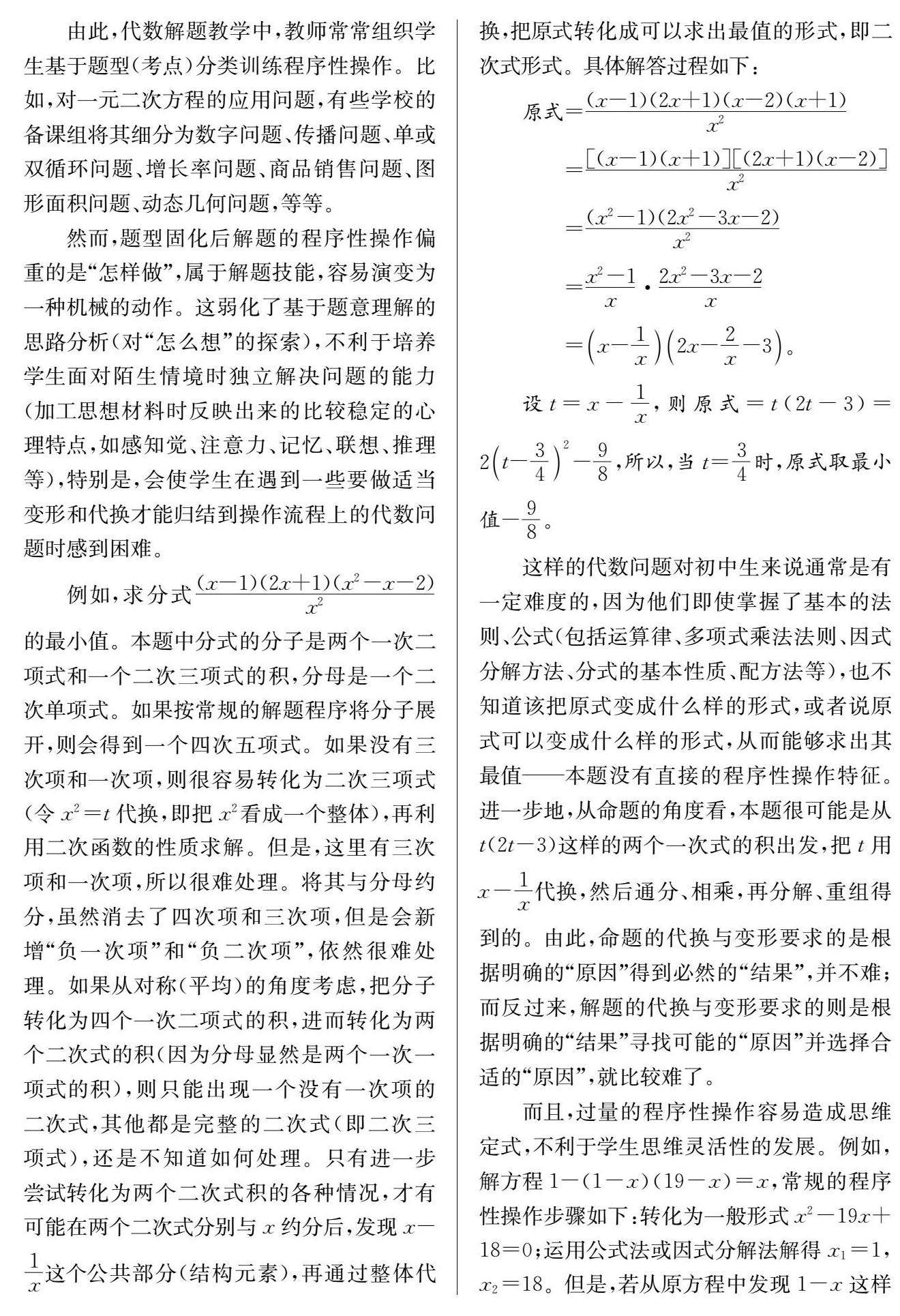 摘要:代数解题教学常常偏重程序性操作(“怎样做”),而弱化思路分析(对“怎么想”的探索),不利于培养学生面对陌生情境时独立解决问题的能力,特别是,会使学生在遇到一些要作适当变形和代换才能归结到操作流程上的代数问题时感到困难;也容易造成思维定式,不利于学生思维灵活性的发展。对此,代数解题数学要重视由代数式子的一般性与可变性决定的“代”和“变”,努力培养学生的结构感。(剩余1696字)