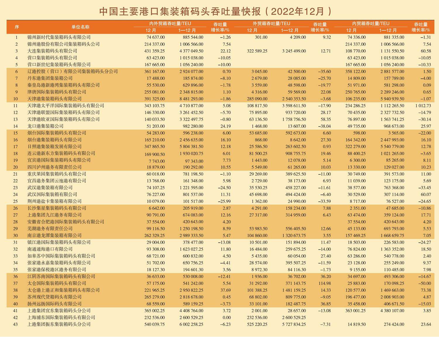 中国主要港口集装箱码头吞吐量快报(2022年12月)