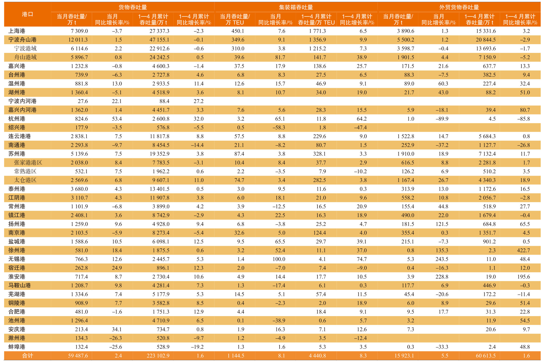 2025年4月长三角地区主要港口吞吐量