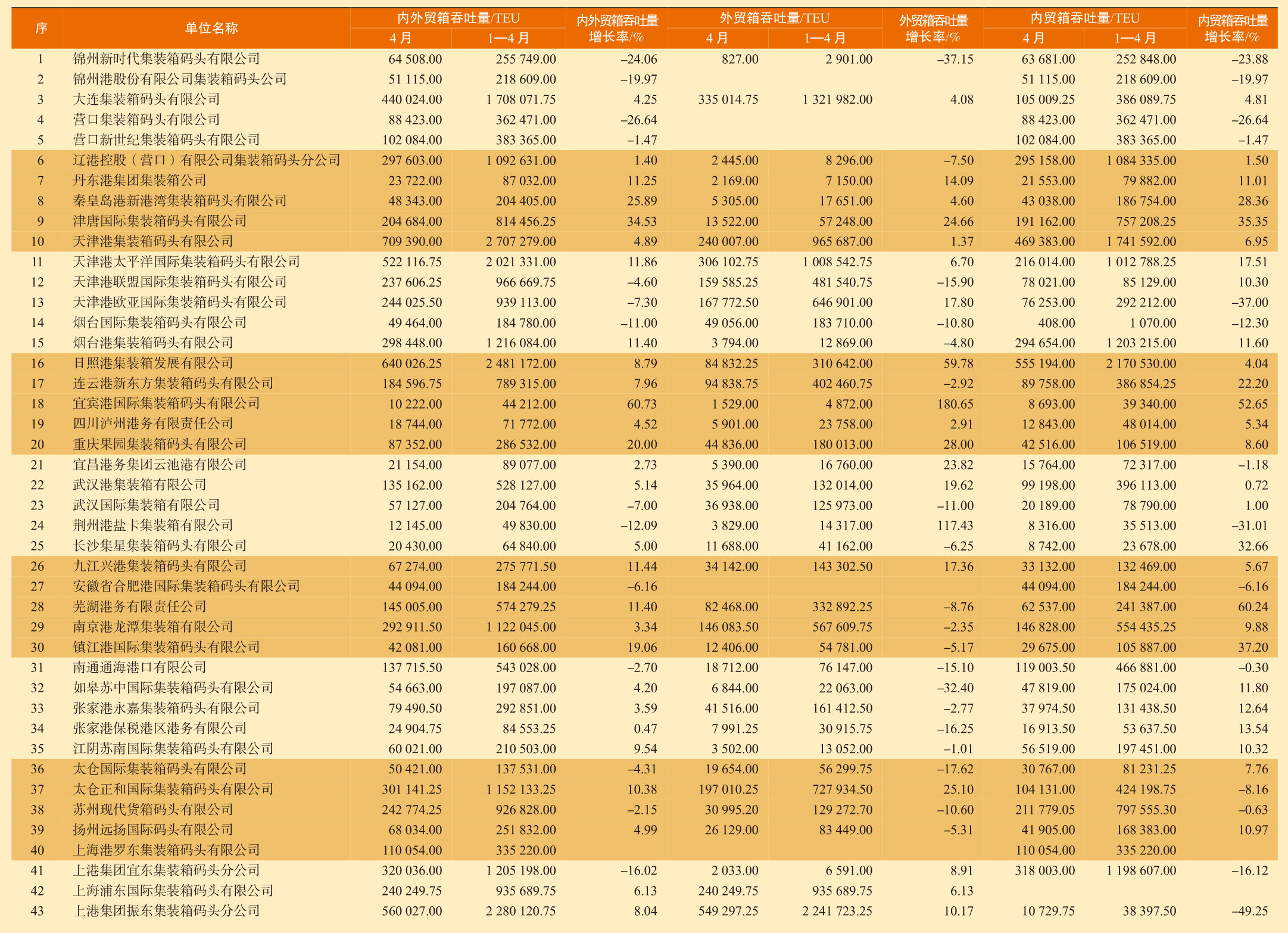 中国主要港口集装箱码头吞吐量快报(2025年4月)