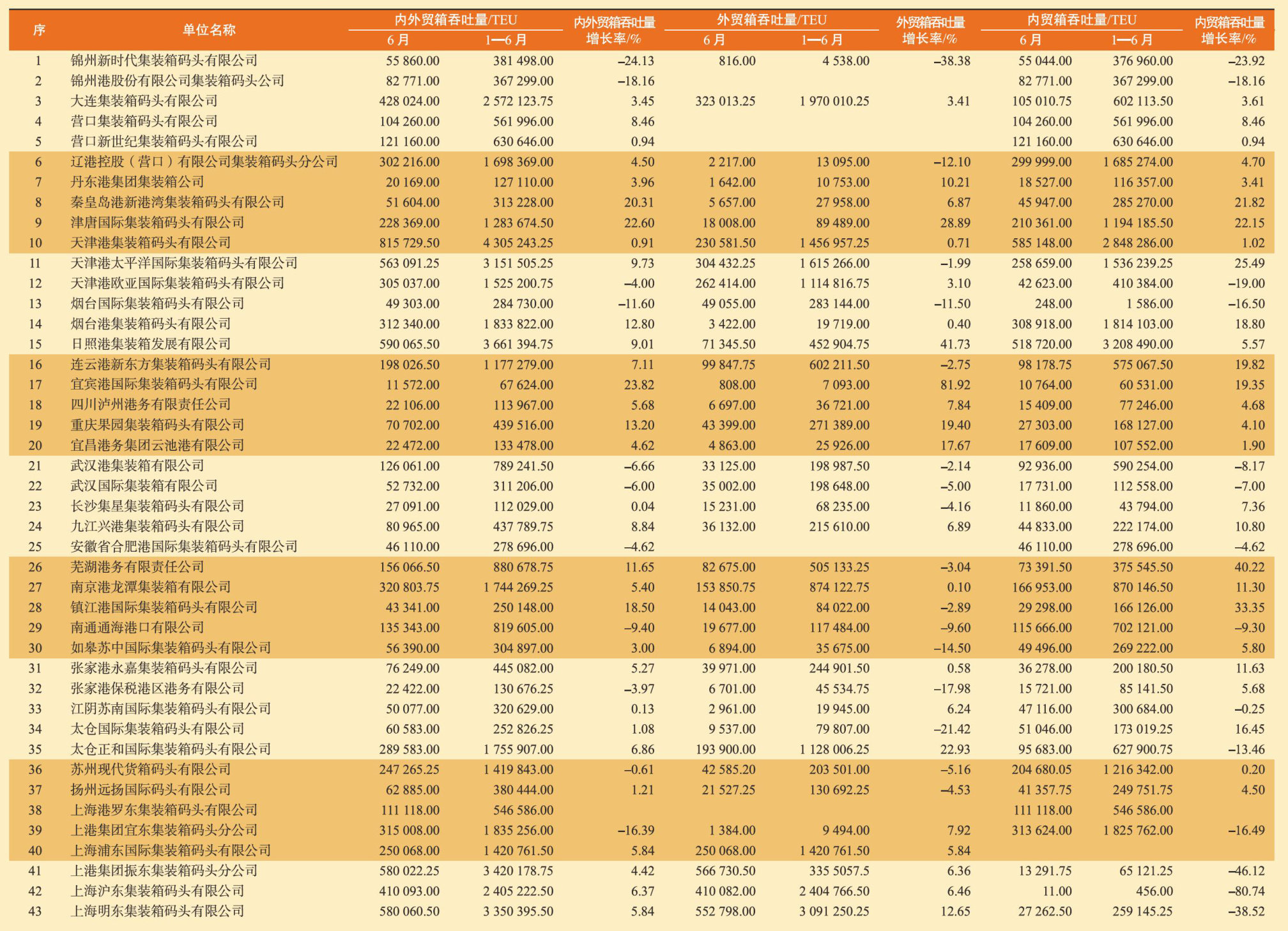 中国主要港口集装箱码头吞吐量快报(2025年6月)