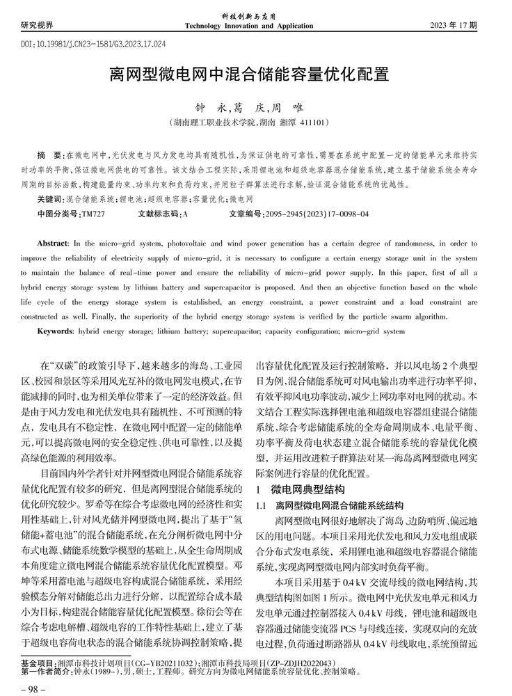 摘 要:在微电网中,光伏发电与风力发电均具有随机性,为保证供电的可靠性,需要在系统中配置一定的储能单元来维持实时功率的平衡,保证微电网供电的可靠性。该文结合工程实际,采用锂电池和超级电容器混合储能系统,建立基于储能系统全寿命周期的目标函数,构建能量约束、功率约束和负荷约束,并用粒子群算法进行求解,验证混合储能系统的优越性。(剩余4089字)