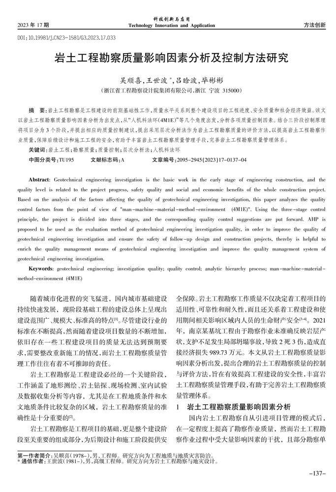 摘 要:岩土工程勘察是工程建设的前期基础性工作,质量水平关系到整个建设项目的工程进度、安全质量和社会经济效益。该文以岩土工程勘察质量影响因素分析为出发点,从“人机料法环(4M1E)”等几个角度出发,分析各项质量控制因素。结合三阶段控制原理将项目分为3个阶段,并提出相应的质量控制建议,提出采用层次分析法作为岩土工程勘察质量的评价方法,以提高岩土工程勘察作业质量,保障后续设计和施工工程的安全,有助于丰富岩土工程勘察质量管理手段,完善岩土工程勘察质量管理体系。(剩余6088字)