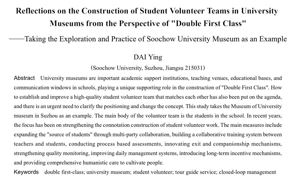 摘要 高校博物馆是学校重要的学术支持机构、教学场所、育人基地、交流窗口,在“双一流”建设中具有独特的支撑作用。如何建立健全相匹配的高质量学生志愿者队伍也随之提上日程,亟须厘清定位,转变理念。本研究以苏州大学博物馆为例,志愿者队伍主体为本校在读学生。近年来重点加强学生志愿者工作的内涵建设,主要措施有多方联动扩大“生源”、师生协同共建培训体系、开展过程化考核、创新退出与陪伴机制、强化质量监测、健全日常管理体系、引入长效激励机制、全方位人文关怀铸魂育人等。(剩余6650字)