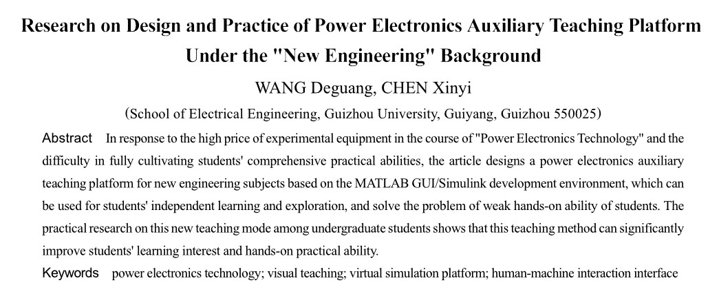 摘要 针对“电力电子技术”课程实验设备价格高昂和难以充分培养学生综合实践能力的问题,文章基于MATLAB GUI/Simulink开发环境,设计了一个面向新工科的电力电子辅助教学平台,可用于学生自主学习和探索,解决学生动手能力弱的问题。将该新型教学模式在本科生中进行实践研究,结果表明该授课方式能明显提高学生的学习兴趣和动手实践能力。(剩余4370字)