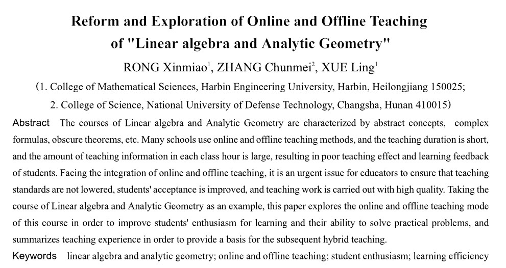 摘要 线性代数与解析几何课程具有概念抽象、公式复杂、定理晦涩难懂等特征,众多学校采用线上线下结合的授课形式,且授课中教学时长较短,每课时内授课信息量较大,导致课程的教学效果及学生的学习反馈欠佳。面对线上线下融合教学,如何保证教学标准不降、学生接受度提升、教学工作高质量开展,是教育工作者亟须解决的问题。(剩余3854字)