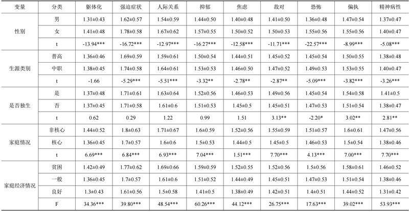 摘 要 目的:了解大学生心理健康现状及影响因素,以便科学开展心理健康工作。方法:于2023年9月―10月,使用SCL―90对安徽省某高职院校16557名高职大学生的心理健康状况进行调研,采用独立样本T检验,多因素方差及Logistic回归分析大学生的心理健康现状及影响因素。结果:①性别、生源类别、家庭经济状况、是否独生子女、家庭情况与SCL―90得分显著相关(<0.05);②多元Logistic回归分析结果显示,性别、是否是独生子女、家庭经济情况是SCL―90严重程度的影响因素。(剩余4631字)