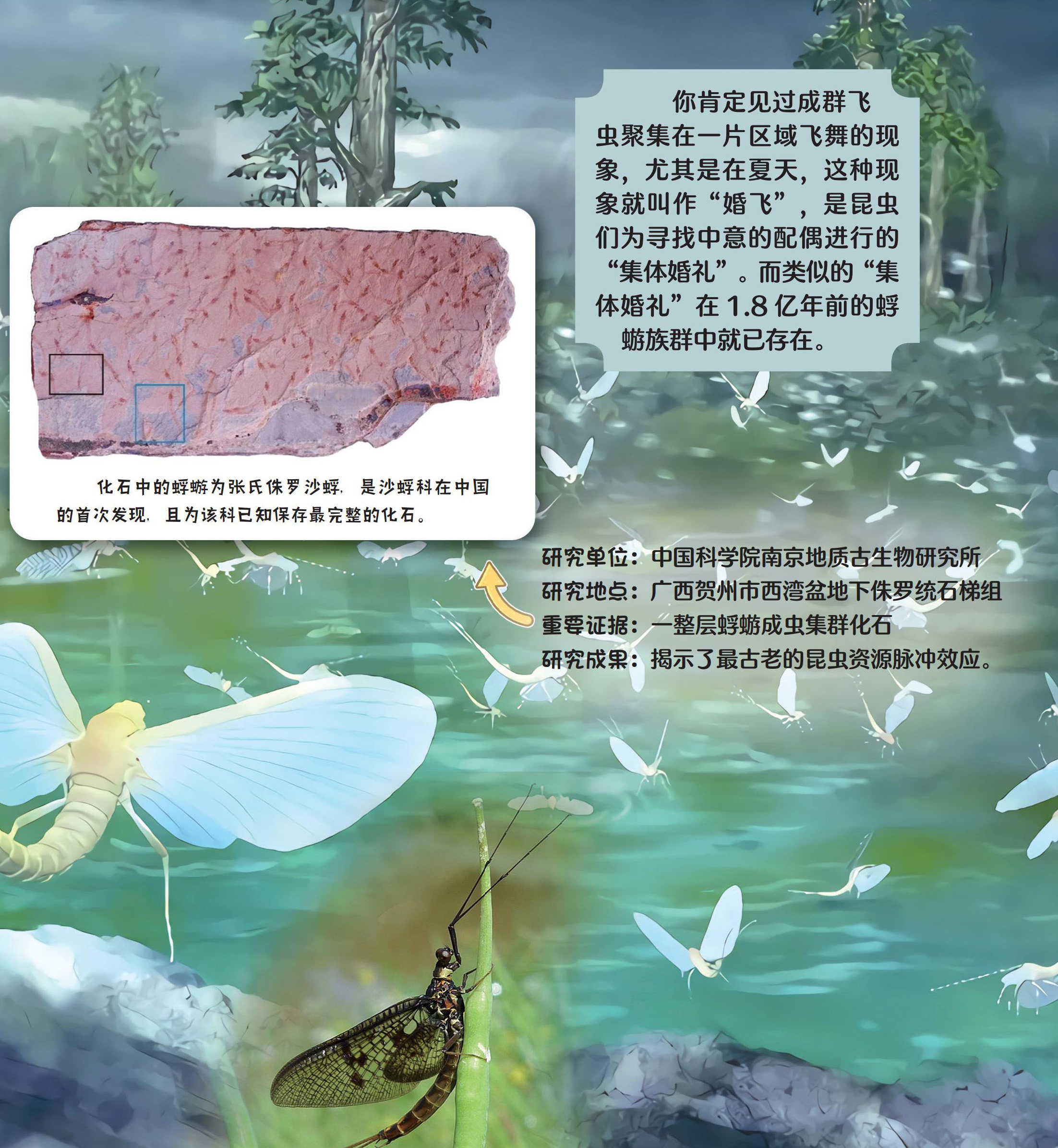 你肯定见过成群飞虫聚集在一片区域飞舞的现象,尤其是在夏天,这种现象就叫作“婚飞”,是昆虫们为寻找中意的配偶进行的“集体婚礼”。而类似的“集体婚礼”在1.8亿年前的蜉蝣族群中就已存在。