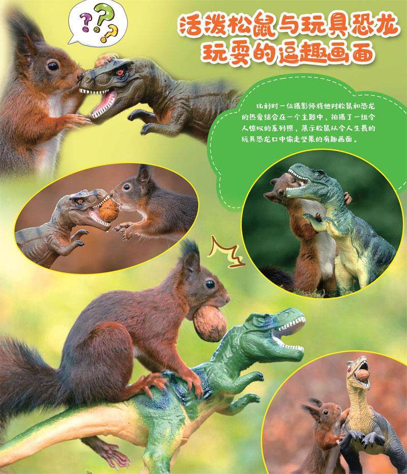 活泼松鼠与玩具恐龙玩耍的逗趣画面