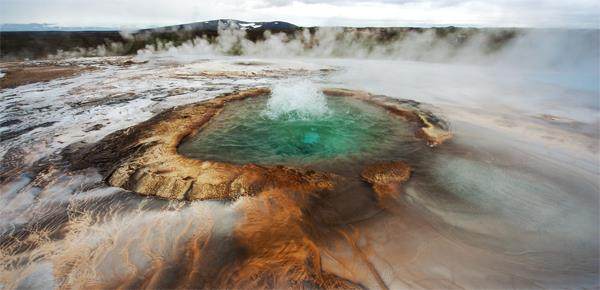 一些科学家认为生命并非始于深海热液喷口,而是诞生于地表的淡水温泉中。图中所示是位于冰岛惠拉维德利的一个地热池,是有利于生命形成的环境之一