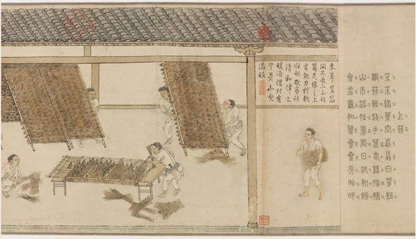 下面是《耕织图》中有关这一阶段的七幅画作,生动地向我们展示了从吐丝成茧到缫茧成丝抑或孕育新生的奇妙过程。蚕农分工合作,为即将“上山”的蚕虫准备好蔟具;恐春寒料峭,又燃起炭火为蚕虫取暖;待肥壮的蚕虫一一将自己裹成温润洁白的“玉卵”后,再细细取下,密密窖藏;待农忙过去,剥茧抽丝,汇成透亮顺滑的银色河流;而未经窖藏的茧子早已化蛾,在蚕农悉心的照料下孕育来年的希望。(剩余4215字)