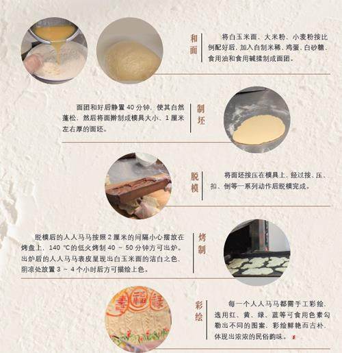 炉食人人马马的传统制作工艺有两种——刀模法和扣模法。刀模法指用刀片做成模具的形状,然后将面擀成一个大面饼,比如做一个“人骑马”形状的刀模,再将其扣在面饼上,扣出“人骑马”形状的人人马马后,用小镊子把人物以及动物的五官等细节捏出来,之后进行烤制,最后描绘色彩。炉食人人马马目前所采用的是扣模法,主要有和面、制坯、脱模、烤制、彩绘五大步骤。(剩余0字)