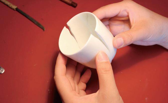 将破碎瓷器摊开对位、找碴、对缝,用胶纸在对合成形的瓷器里粘复,用钩绳捆扎固紧,此时的瓷器基本上是完好成形的。(剩余285字)