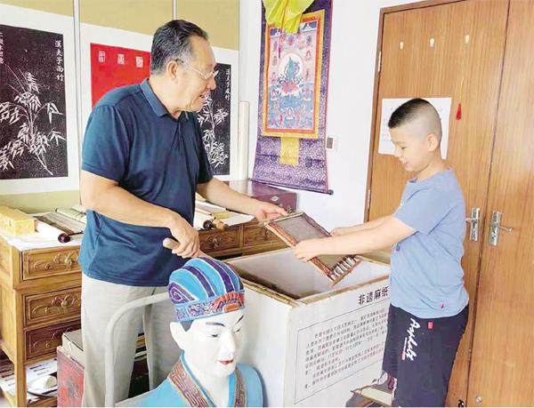 郭安民(左)在给小朋友讲非遗麻纸的知识。图片由受访者提供