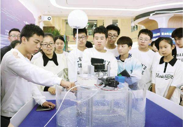 学生们体验抽水储能站演示装置 。科学导报记者刘娜摄