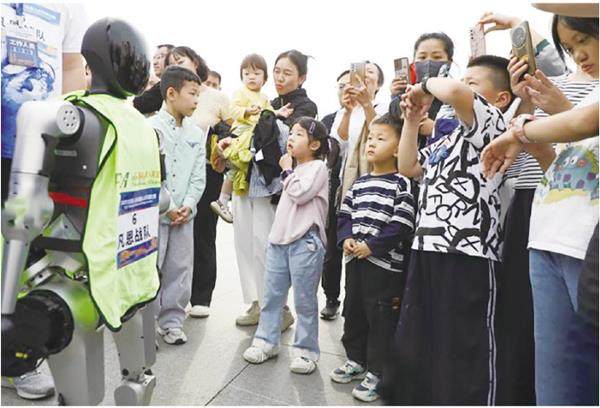 9月20日,山西省太原市晋阳湖公园,儿童围观参加欢乐跑比赛的人形机器人。(剩余0字)