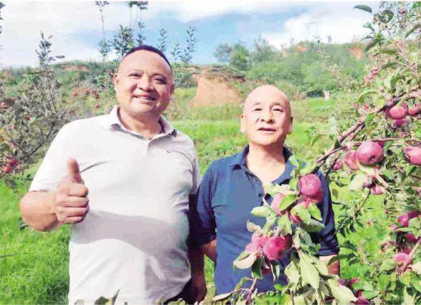河南客商在姚泽波(右)的苹果园中考察。图片由受访者提供
