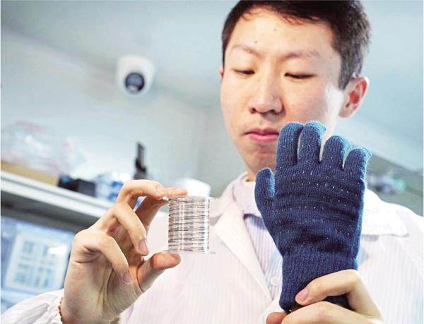 1月19日,研究人员展示成卷的“纤维芯片”(左)与织入“纤维芯片”可制成的智能触觉手套。