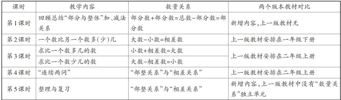“数量关系"是《义务教育数学课程标准(2022年版)》以下通称“新课标"对于数与代数学习领域新提出的主题,该主题通过整合知识、分阶段教学和强化应用,构建系统的数量关系认知体系,旨在提升学生解决实际问题的综合能力。人教版小学数学新教材一年级下册第六单元“数量间的加减关系"通过引导学生回顾并总结“部分与整体"的加减关系开启研究“相差问题"的加减关系,进一步拓展了学生对加减法意义的认知与理解。(剩余5142字)