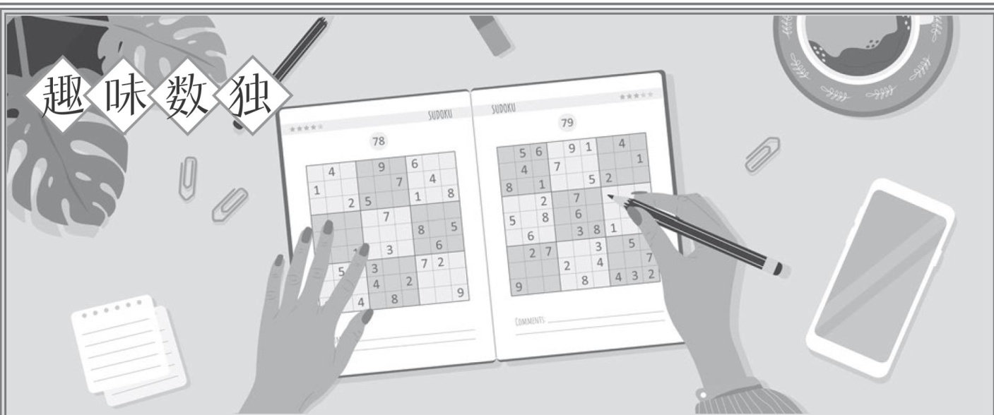 标准数独的游戏盘面是一个 9×9 的表格,由81个格构成。水平方向排列的9个格组成行;垂直方向排列的9个格组成列;粗线条内 3×3 的9个格组成宫。请用数字1、2、3、4、5、6、7、8、9将所有格子填满,要求每行、每列、每宫的数字不重复。(剩余0字)
