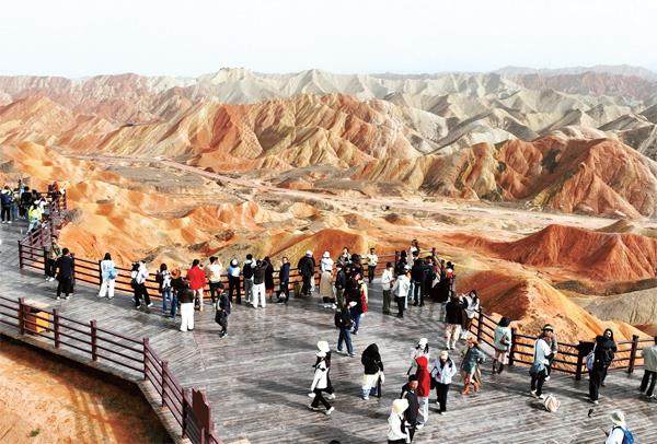 2025年5月4日,游客在位于甘肃省张掖市的七彩丹霞景区游览
