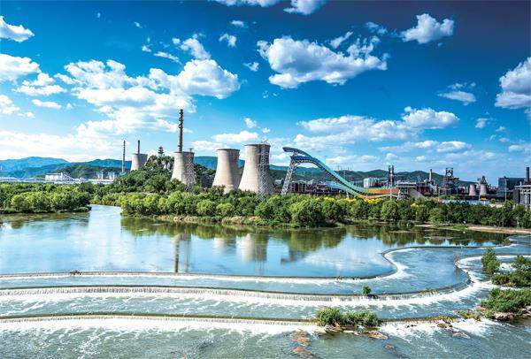 北京市石景山区永定河畔,首钢园的工业遗迹与碧水蓝天相映(王保生/摄)