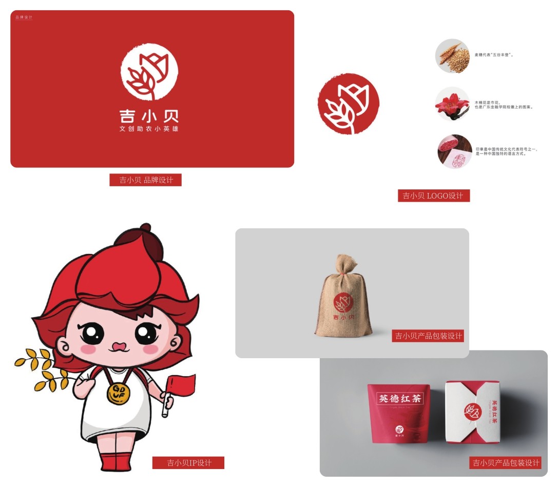 设计理念:广东金融学院校园文创品牌《吉小贝——文创助农小英雄》的设计理念基于“红色文创+助农”模式,融合了红色文化、校园文化和岭南文化,旨在打造一个代表新时代岭南年轻人自身形象的红色文创IP,并通过这个形象寄托年轻人们的红色情怀和助农行动。品牌的LOGO主要元素包括木棉花、麦穗和印章,品牌IP形象的设计灵感源自木棉花,又被称为吉贝,吉小贝作为助农的小英雄将红色的正能量传递给年轻人群,推动助农事业的发展。(剩余260字)