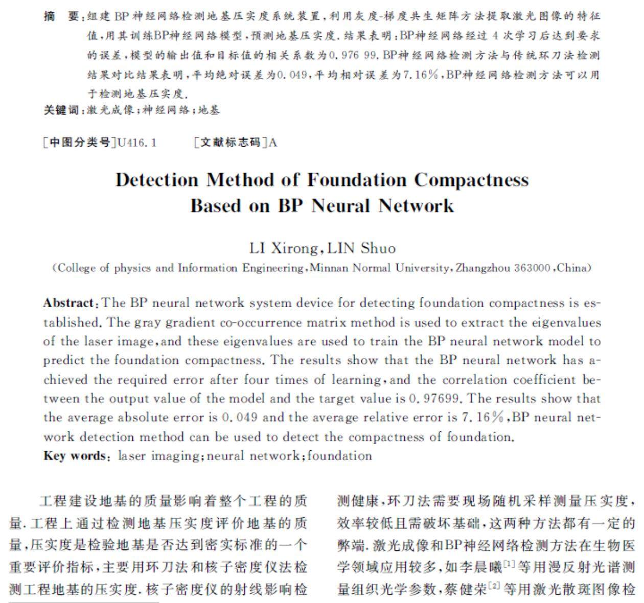 摘要:组建BP神经网络检测地基压实度系统装置,利用灰度梯度共生矩阵方法提取激光图像的特征值,用其训练BP神经网络模型,预测地基压实度.结果表明:BP神经网络经过4次学习后达到要求的误差,模型的输出值和目标值的相关系数为0.976 99.BP神经网络检测方法与传统环刀法检测结果对比结果表明,平均绝对误(剩余4378字)