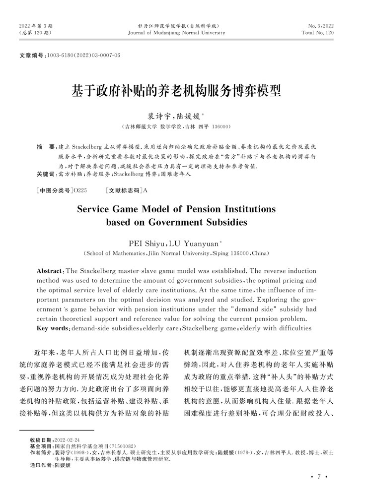 摘要:建立Stackelberg主从博弈模型.采用逆向归纳法确定政府补贴金额、养老机构的最优定价及最优服务水平,分析研究重要参数对最优决策的影响,探究政府在“需方”补贴下与养老机构的博弈行为,对于解决养老问题、减缓社会养老压力具有一定的理论支持和参考价值.