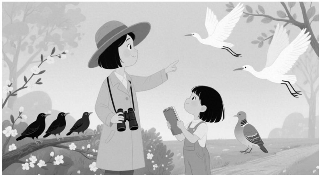 我一边仔细观察周围的鸟,一边听老师教我如何识鸟。一路上,有许多鸟儿在空中自由翱翔,时不时落在树枝上歇息。这里有领地意识极强的白鹭,有成群结队的乌鸫,有用“点头舞”求偶的斑鸠…