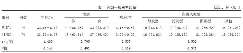 [摘要]目的:探究窄谱中波紫外线(NB-UVB)照射联合他卡西醇软膏对颜面部稳定期白癜风的治疗效果。方法:选取2018年3月-2020年11月到四川大学华西广安医院就诊的稳定期白癜风患者148例为研究对象,采用随机数字表法将其随机分为观察组和对照组各74例。对照组采用NB-UVB照射治疗,在对照组的基础上给予观察组他卡西醇软膏联合治疗。(剩余10415字)