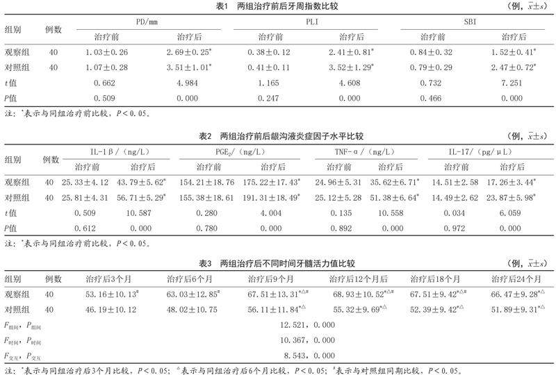 [摘要]目的:研究成人正畸患者佩戴不同矫治器对牙周微环境及美观性的影响。方法:选取笔者医院2018年2月-2020年2月收治的80例成人正畸患者,采用随机数字表法分为对照组(n=40)和观察组(n=40)。对照组行传统托槽矫治器治疗,观察组行自锁托槽矫治器治疗。比较两组治疗前后牙周指数[菌斑指数(Plaque index,PLI)、出血指数(Sulcus bleeding Index,SBI)、探诊深度(Probing depth,PD)]及龈沟液炎症因子[白介素-1β(Interleukin-1β,IL-1β)、白介素-17(Interleukin-17,IL-17)、前列腺素E2(Prostaglandin E2,PGE2)、肿瘤坏死因子-α(Tumor necrosis factor-alpha,TNF-α)],对比两组不同时点牙髓活力,观察两组并发症发生率及美观满意度。(剩余10450字)